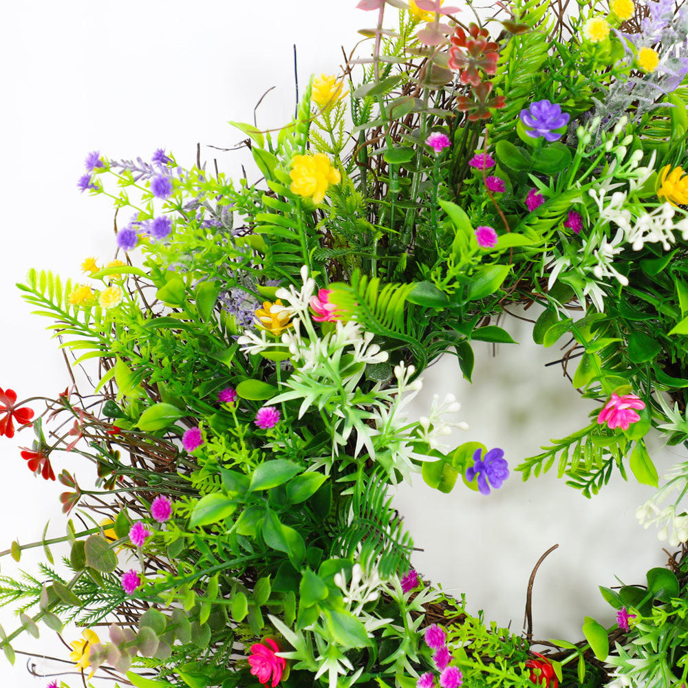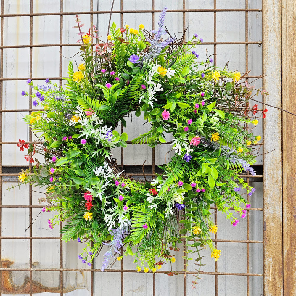 This enchanting floral wreath features an array of lifelike wildflowers.