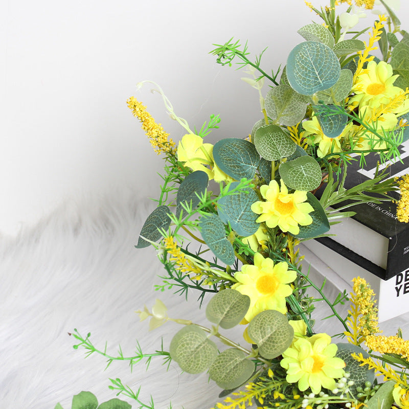 This spring wreath is simple and fresh. It is made of yellow winter jasmine and eucalyptus leaves woven into a ring. The small flowers like wheat ears sway in the wind. There is a leisurely atmosphere of a farmhouse, ready for your spring.